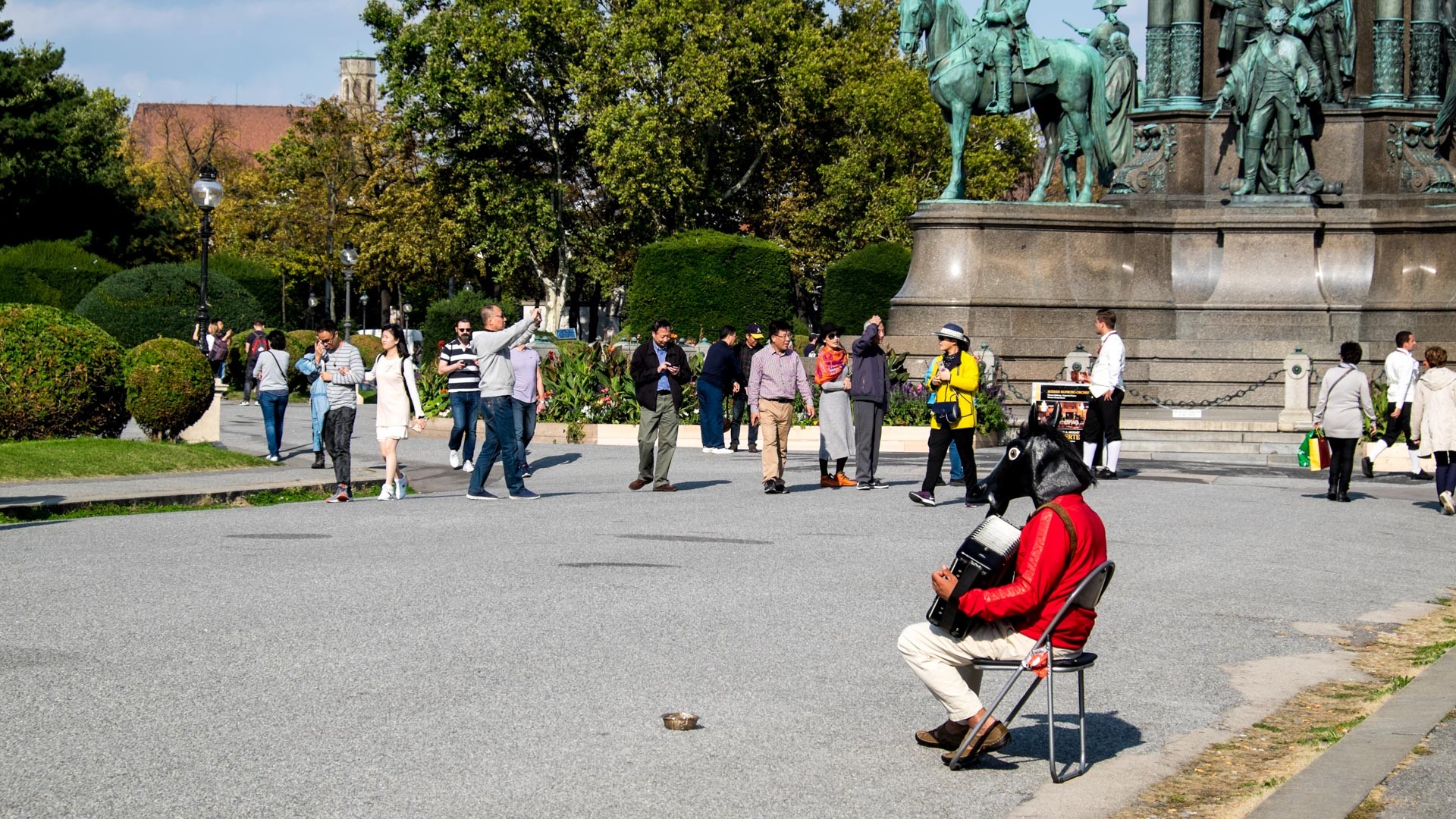 Wien. Haupt- und Weltsstadt in Österreich. Ein Ort an dem Kultur, Multikulti und Geschichte auf den weltbekannten Schmäh treffen. Wien ist bunt, die Uni mitten in der Stadt, viele kleine Cafés, die die Brücke zwischen Kaffeehaus Kultur und Moderne schlagen ohne dabei die Geschichte und Tradition zu vergessen. Wien ist eine Haupstadt, auf dessen Plätzen Musikanten mit Pferdemasken musizieren. Bonaparte lässt grüßen. Das Foto ist im September entsanden und so vermutlich eines der letzten seiner Art, denn set dem 1. Oktober 2017 ist das Anti-Gesichtsverhüllungsgesetz (AGesVG) in Kraft. Ziel ist es Nikab und Burka zu verbieten. Es soll den Östereichern*innen wohl die Angst vor Überfremdung nehmen. Getreu dem Motto, alles was man nicht sieht, ist nicht schlimm (der Islam). Und es soll den aktuellen Ruck hin zum Nationalsimus (nicht nur in Österreich) befriedigen. Bringt den "Konservativen" bestimmt noch mehr stimmen. Wie schwachsinnig dieses in einer bunten Stadt wie Wien ist, ist denke ich offensichtlich, denn der Straßenmusikant dürfte so auch nicht mehr auftreten. Egal an wen oder was er glaubt oder besser, nicht glaubt.