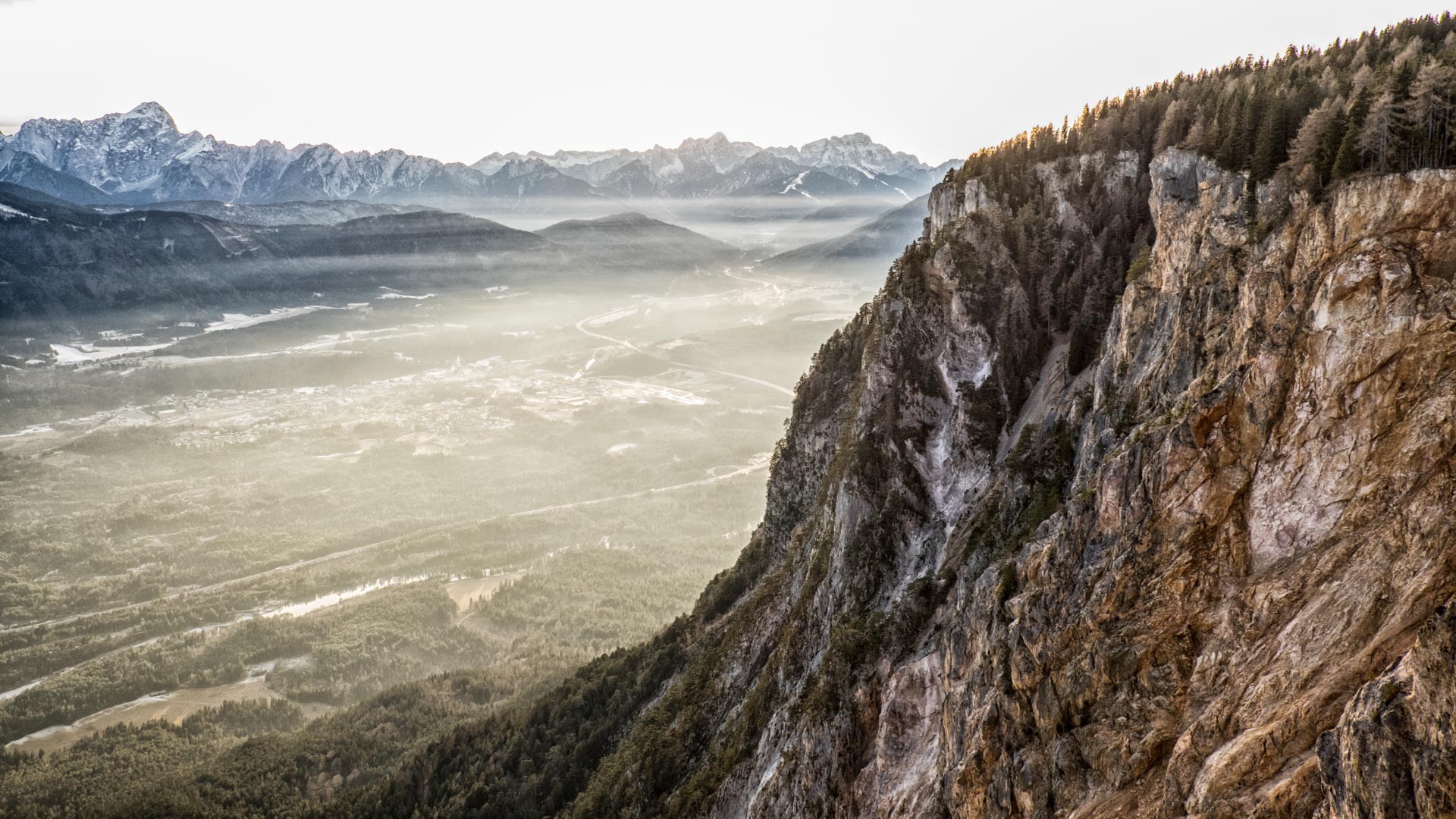 Vor mir liegen die Berge, der Hochnebel und das Dreiländereck Österreich, Slowenien, Italien. Zumindest in meinem Sichtfeld, wenn ich nach vorne schaue. Wen ich herunterschaue, blicke ich den Abgrund. Es ist da also Nichts. Ich stehe auf einer Aussischtsplattform, deren letzte Meter den Blick entlang des Hangs in den Abgrund freigeben. Zwischem dem sicheren Absturz und meinem sicheren Stand nur etwas Stahl. So richtig konnte ich mich nicht über den herlichen Ausblick, den Hochnebel im Tal und über das vor sich hinbröckelnde Bergmassiv zu meiner rechten freuen. Ich musste während ich auf dieser Plattform stand nur daran denken, ob die Geologen, Statiker und Architekten wohl auch alles richtig berechnet hätten...