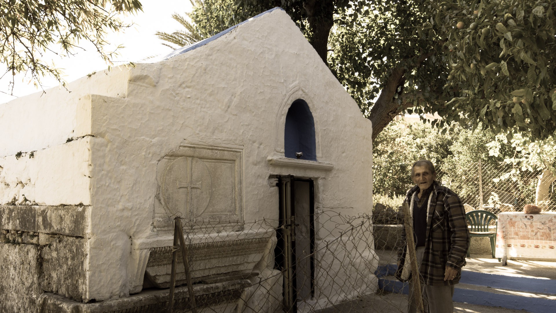 Es ist der vorletzte Urlaubstag auf Kos, ich bin mit meinem Vater auf der Insel unterwegs. Wir haben einen Tag Zeit um alles zu sehen und mein Vater spielt den Guide (er hat am Tag davor den Reiseführer gelesen, während ich es vorzog Gin-Tonic zu trinken). Fahren wir also in ein malerisch gelegenes Bergdorf namens Pyli. Normalerweise ein Touristenort, aber am Ende der Saison verirren sich dort wegen der Abgelegenheit wenige Menschen dahin. Warum wir nach Pyli wollten, also ausser der fantastischen Aussicht, wusste mein Vater nicht mehr so genau. Doch dann sahen wir ein Schild, dass uns zu der antiken Grabstätte der Familie von Charmylos führen sollte. Auf dem Weg dahin wurden die Gassen im schmaler, zum Schluss sind wir ausgestiegen und dachten das war es, nichts zu sehen. Allerdings hatten wir einen Weg übersehen, der zu einer winzigen Kirche führte. Vor dieser wartete ein sehr alter Mann, der auf die Kirche aufpasst. Und weil wir erst Person 5 und 6 waren, die sich an diesem Tag dorthin veriirt haben, war er sehr erfreut uns zu sehen und uns sehr viel über das Grab und die Kirche erzählen zu dürfen. Leider war sein Mix aus griechisch, deutsch und englisch für uns schwer entzifferbar, allerdings haben mein Vater und ich uns während des Rest des Tages eine Geschichte daraus zusammengesetzt.
