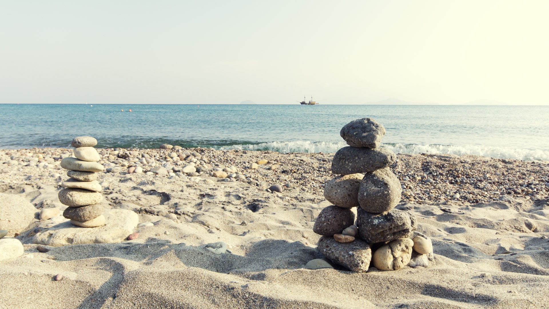 Eigentlich sieht man nur Steine auf dem Bild, kunstvoll gestapelt zwar, aber nicht wirklich ein Piratenschiff. Beim zweiten Blick fällt dann das kleine Schiff im Hintergrund auf, was doch schon viel Ähnlichkeit mit einem Piratenschiff hatte, bei genauerer Betrachtung. Andere Schiffe sind allerdings nicht gekapert worden, sondern Touristen einmal um die Insel Kos geschippert worden. Einmal um die Insel herum dauert übrigens ziemlich genau einen Urlaubstag am Strand, so etwa 8 Stunden.