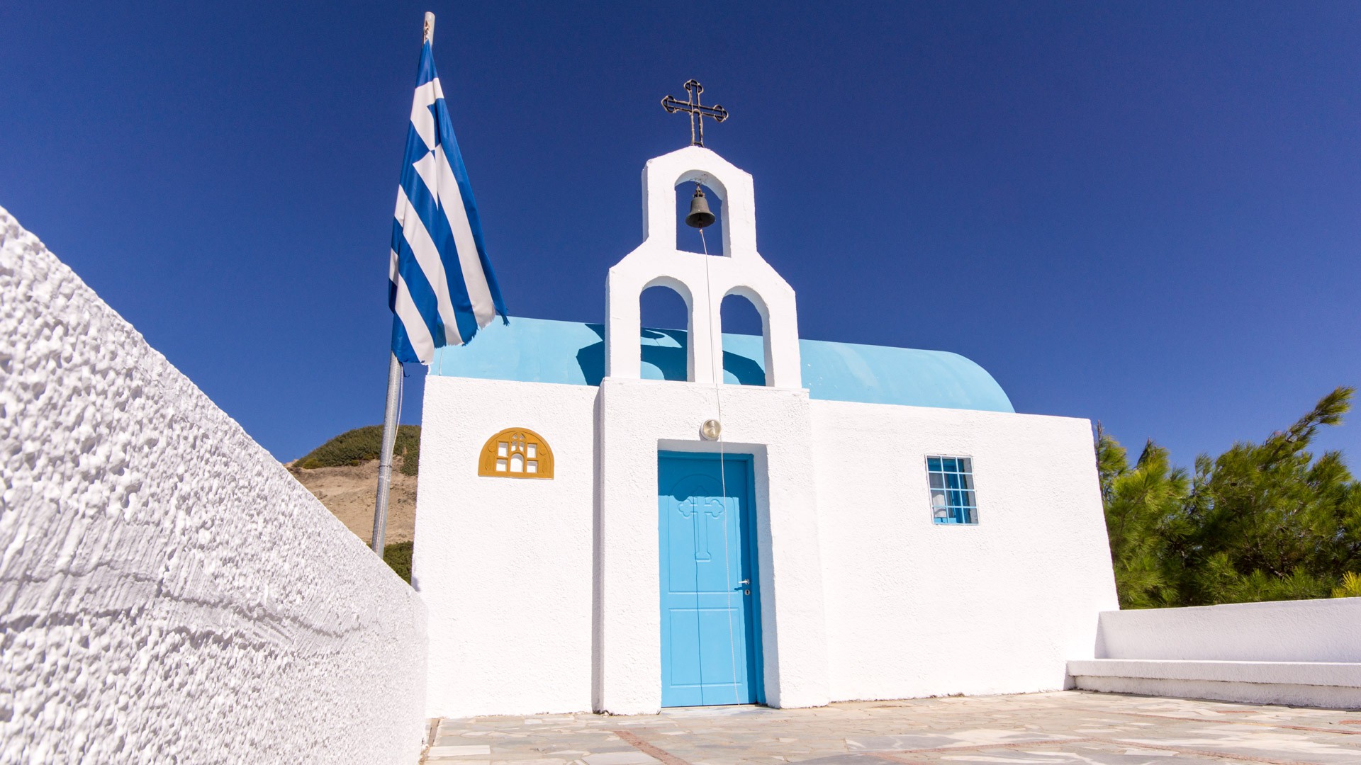 Richtig, Weiße Häuser mit charakteristischen blauen Türen. Davon gibt es auf Kos allerdings nicht allzuviele. Lediglich die kleinen griechisch-orthodoxen Kirchen sind weiß gestrichen und haben blaue Türen. Was allerdings auch zu finden ist, sind Häuser zwar blaue Türen haben, aber gelb gestrichen sind. Passt auch sehr schön zu dem eigentlich immer strahlend blauem Himmel.