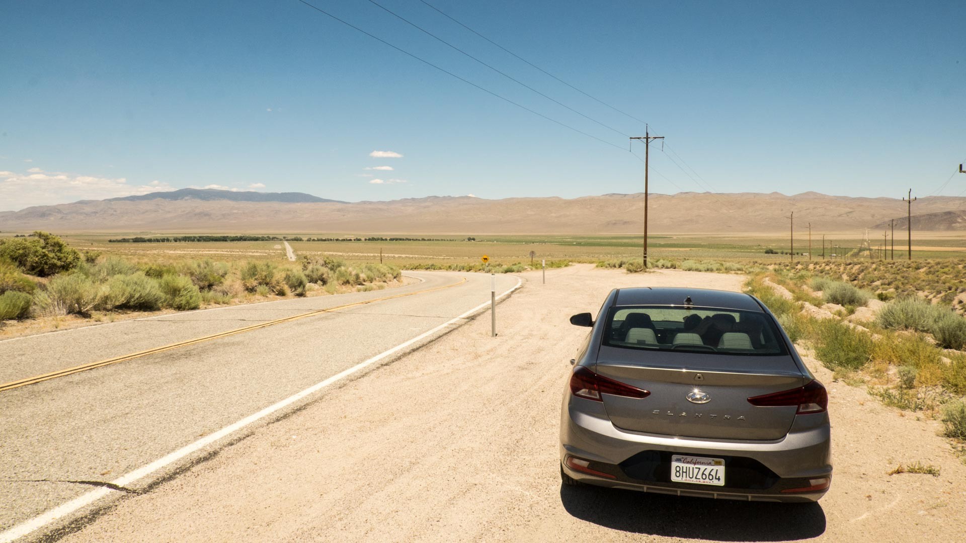 Zwischen diesem und dem vorigen Bild liegen 2 Tage, etwa 400 Meilen und ein super leckerer Burger in Mammoth Lakes, östlich des Yosemite Nationalparks. Der Yosemite Nationalpark war atemberaubend schön, auch wenn wir "nur" einmal durchgefahren sind. Leider hat man gemerkt, dass gerade Ferienzeit ist, denn die Nationalparks sind äußerst voll, wir standen sogar im Yosemite Nationalpark im Stau!…Vom Westen kommend sind wir einmal quer durch den Nationalpark, haben Fotos gemacht, den Blick auf den Half Dome bestaunt und bis zum Osten nach Mammoth Lakes, Ort unserer Unterkunft, gefahren. Äußerst hungrig fragten wir bei Check-In wo es denn was leckeres zu Essen gäbe und uns wurde prompt, nach der Rückfrage ob wir denn into Gouda cheese seien, ein amazing and fantastic Burger angespriesen. Typisch amerikanisch, es ist ja wirklich alles amazing, wonderful oder fantastic. Aber long story short, der Burger war der Hammer, wir waren glücklich ob der Eindrücke aus der Natur, dem leckeren Essens und dass wir unsere erste große Etappe so gut gemeistert hatten. Am nächsten Morgen dann fuhren wir los mit Richtung Las Vegas. Irgendwo, etwa Zwei Stunden nach Abfahrt ist dieses Foto entstanden. Unser Auto für den Roadtrip.