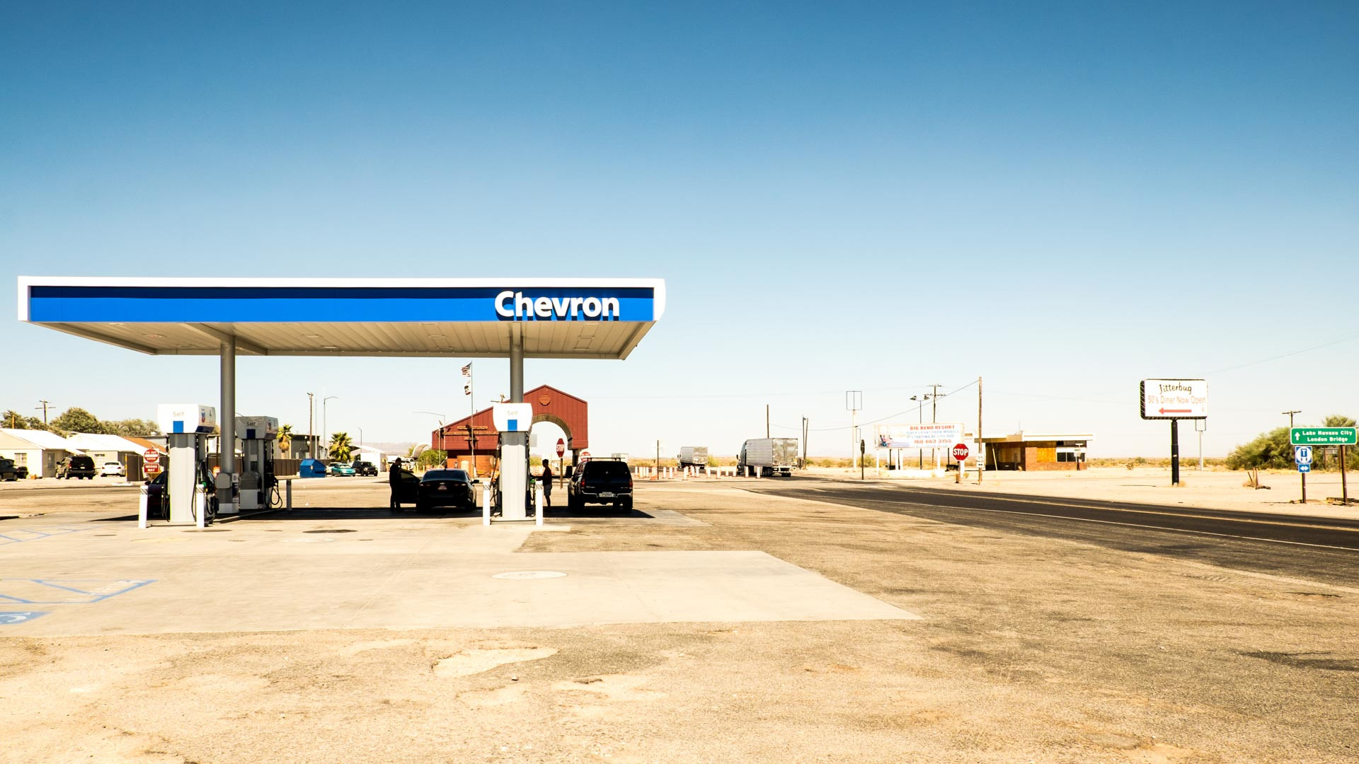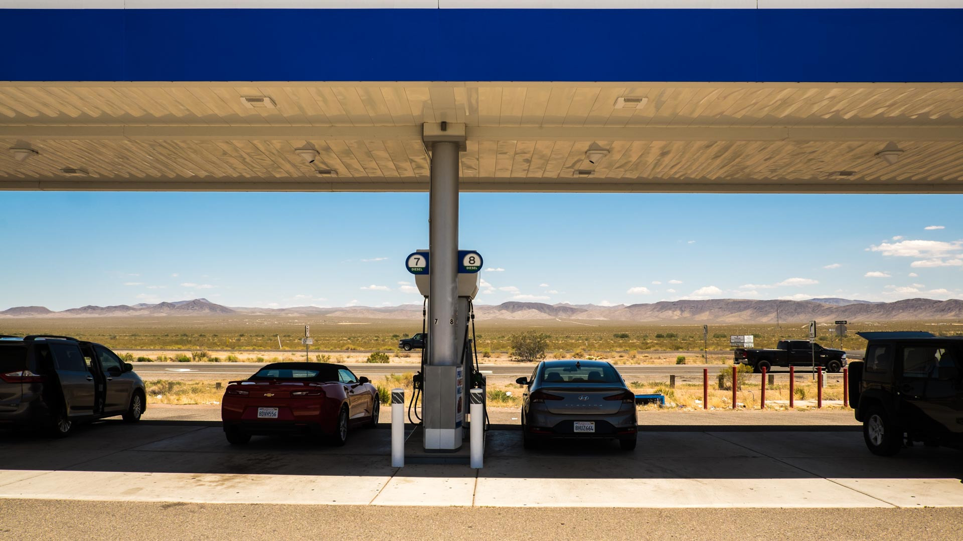 Nachdem wir also am Rande des Grand Canyons einen wunderschönen Sonnenuntergang erleben durften und am Abend in Tusayan eine ganz-und-garnicht wunderschöne Unterhaltung mit einem Hobby-Nazi aus der Schweiz hatten, ging es am nächsten morgen nach Palm Springs. Unsere längste Etappe lag vor uns, mit einer reinen Fahrzeit von über 7 Stunden. Der Weg von Tusayan nach Palm Springs war doch schon arg eintönig. Nichts zu sehen ausser Sand, Sträucher und Felsen in der Ferne, die Straße geht schnurstracks geracdeaus und macht höchstens alle 35 min mal eine kleine Kurve. Dazu muss man sagen, dass es in Arizona auch ziemlich heiß war, sodass das Thermometer bis auf bis auf 118 °F (48 °C) gestiegen ist. Nach einem Großteil der Strecke mussten wir Tanken. Wir waren gerade über die Grenze der Bundesstaaten nach Kalifornien gefahren und kamen in Vidal an diese Kreuzung mit Tankstelle. Sonst war da nichts, bloß die Hitze und die Straße. Eine Szene wie aus einem Film der Coen-Brüder. In der Tankstellen waren auch ein paar komische Gestalten (passend zu besagten Filmen) und eine der größten Basecap Aushwahlen, die ich je gesehen habe (auch passend zu ....). Wer um Himmels Willen kommt hier her um eine Basecap zu kaufen?