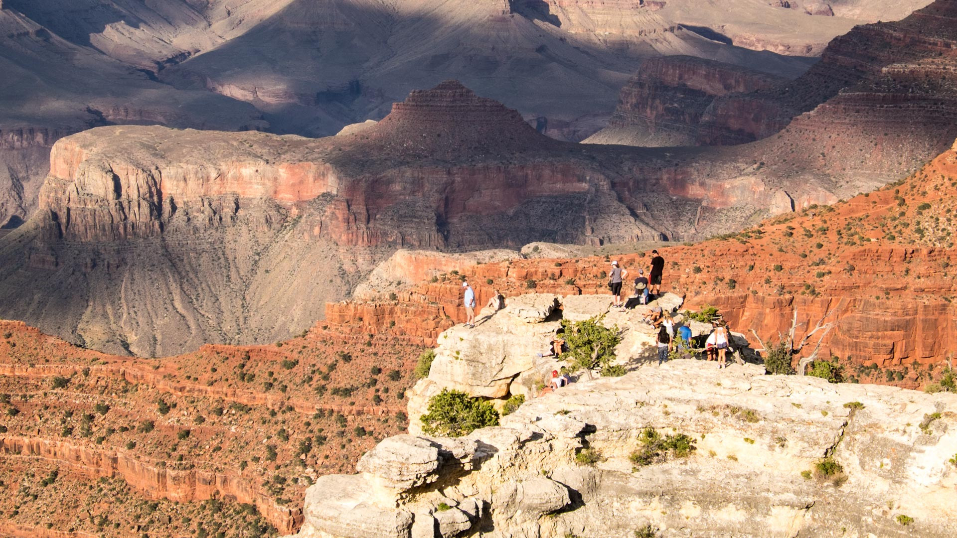 Nun sind wir wie bereits erwähnt stundenlang von Las Vegas gefahren, und je näher wir laut Navi Tusayan kamen, desto eintöniger wurde es. Man erwartet ja was super beeindruckendes, da der Grand Canyon aber nach unten geht, ist er anders als beeindrucke Gebirge nicht am Horizont zu sehen. Wir kamen dann endlich nachmittags in Tusayan an, checkten schnell ein und machten uns auf den Weg zum Grand Canyon Visitor Center am südlichen Ende. Typisch amerikanisch fährt man mit dem Auto fast bis zur Kante des Grand Canyons. Nur aussteigen, 30 m zu Fuss gehen und staunen. Ich habe noch nie so viel Weite auf ein Mal gesehen. Es war ein gigantischer, überwältigender Anblick. Wir hatten etwas Zeit eingeplant um bis zum Mather Point zu laufen und während des späten Nachmittags auf die untergehende Sonne zu warten. Der Grand Canyon wechselte also mit sinkendem Sonnenstand stetig seine Farbe zu immer kräftigerem Rot. Wir haben dann einen der herllichsten Sonnenuntergänge gesehen, den ich bisher erlebt habe.