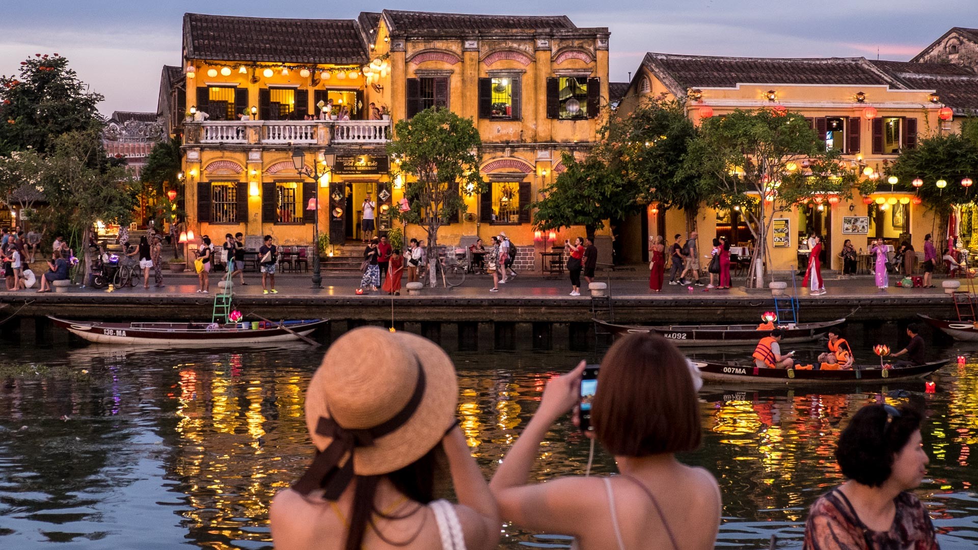 Nochmal zur Abendstimmung in Hội An: Die Lichter der Lampions entlang der beiden Kanalseiten, die gelben Häuser, deren Architektur von der bewegten Geschichte und dem Einfluss der Europäer zeugt und die die tief stehende, langsam untergehende Sonne. Eine entspannte Stimmung und natuerlich - noch mehr Touristen als tagsüber. Aber es macht in dem Moment nichts, weil die Kulisse, die die Altstadt von Hội An bietet, einfach atemberaubend schön ist.