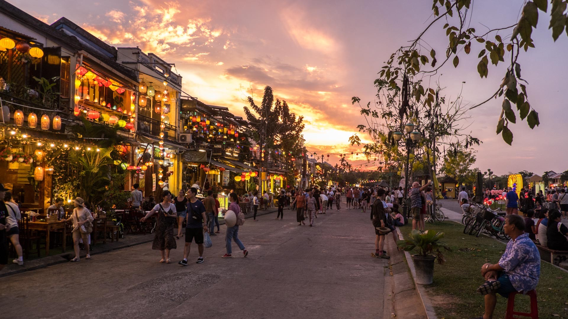 Die Stimmung in Hội An wird abends gleich viel entspannter, wenn die Sonne langsam untergeht. Und obwohl nun noch mehr Touristen unterwegs sind, freut man sich, dass die Sonne nicht mehr gandenlos vom Himmel brennt, die ohnehin schon stimmungsvoll gelbe Altstadt nun in warmes Licht getaucht wird und die Lampions in den Straßen angehen. Dann kann man durch die Straßen laufen, ein selbstgebrautes bia hơi trinken und zuschauen, wie sich die Farben der Stadt zunehmend durch die untergehende Sonne ändern und langsam die blaue Stunde einsetzt. Die meisten Touristen sind dann selfie-machend entlang der Kanäle oder in kleinen Booten auf den Kanälen unterwegs.