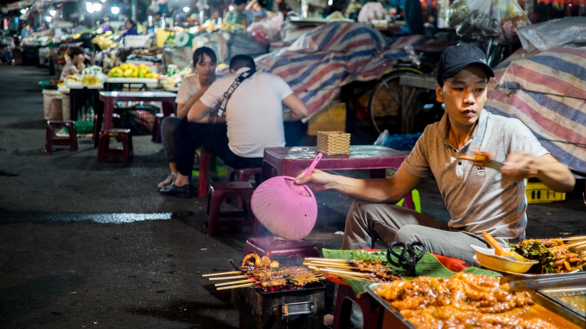 Nach so einem Abend in Hội An, nach Einsetzen der Dämmerung, kommen die ganzen kleinen Streetfood Stände zum Vorschein. Jeder bietet estwas anderes an, oftmals sind es selbst marinierte Spieße aus Fleisch oder Fisch, manchmal auch Oktopus. Interessnaterweise weiß man nie so genau, ob das chicken auch wirklich chicken oder etwas anderes ist. Und trotz dessen, dass man nicht weiß, was man nun genau ist, und trotz dessen, dass man zwei Stunden vorher vorzüglich im Restaurant gegessen hat, schmecken die Sachen, die man direkt heiß vom Grill bekommt doch am besten. Vielleicht liegt es aber auch einfach an meiner chop stick diet. So gut bin ich beim Essen mit Stäbchen nun auch wieder nicht, wahrscheinlich werde ich vorher einfach nicht satt!