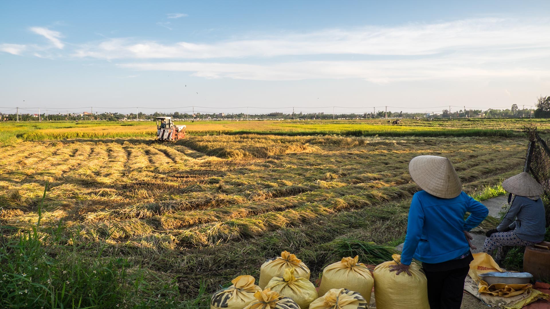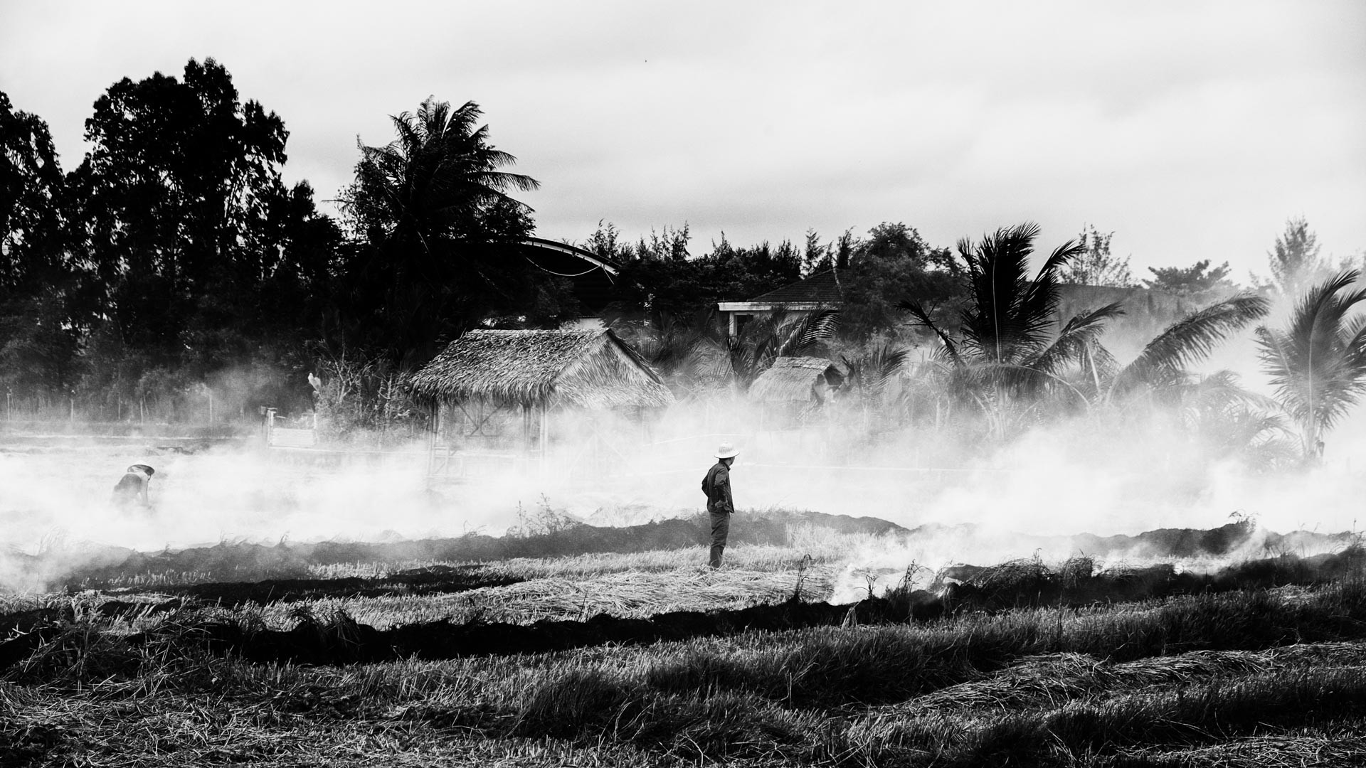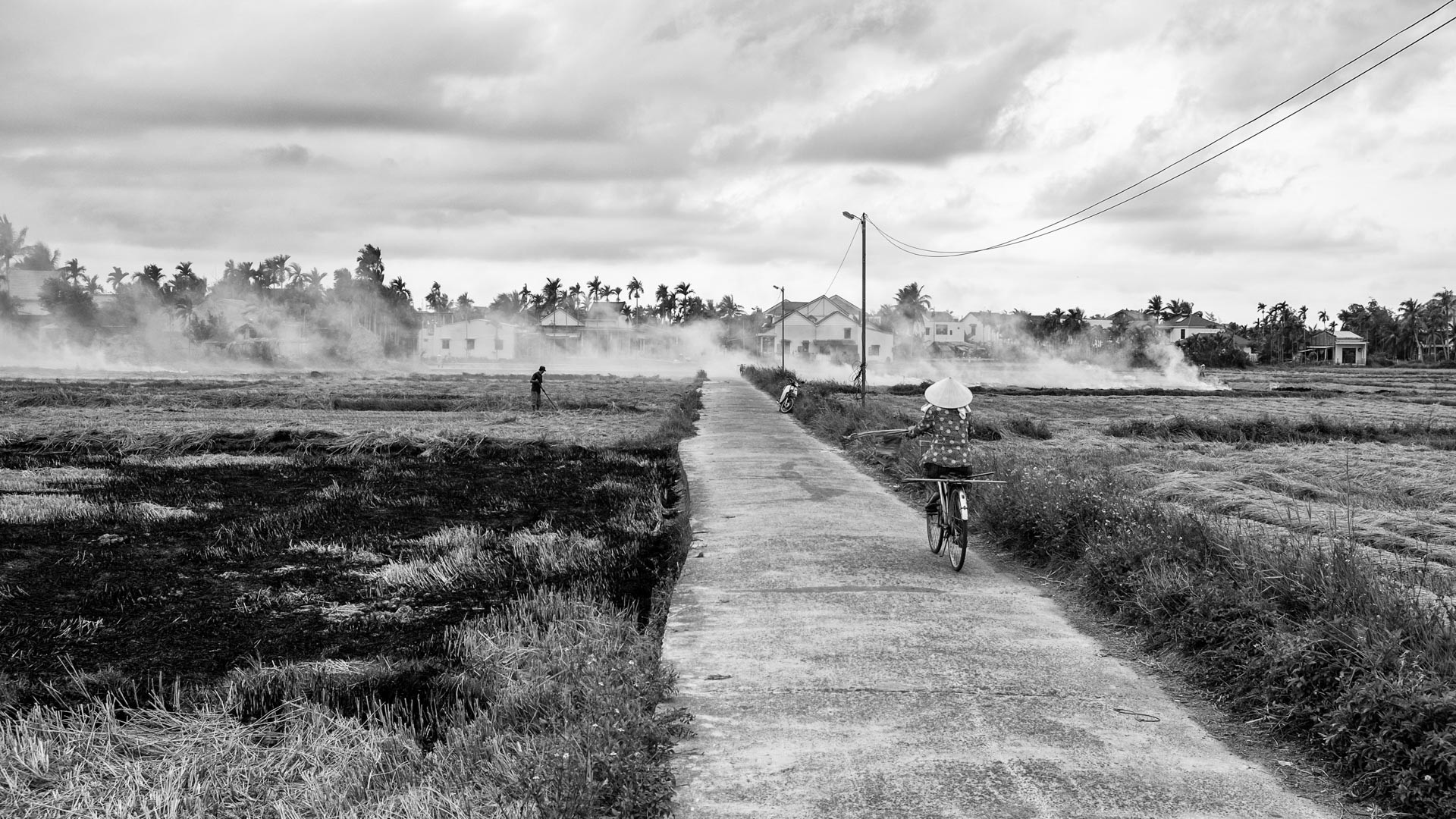 Es entspricht schon ein wenig dem Klischee, dass uns das Thema Reis während unserer Reise in Vietnam auf jeder Station begleitet hat. Überall im Land konnte man entweder die sattgrünen Reisfelder, die unter Wasser stehenden Reisterassen oder die frisch abgeernteten Reisfelder bestaunen. Zum Ende der Reise wohnten wir in einem Homestay inmitten der Reisfelder. Zu der Zeit war gerade die Reisernte im vollen Gang, am ersten Tag konnten wir einen Mini-Mähdrescher bei der Arbeit sehen. Zwei Tage später, als ich aus der Innenstadt von Hội An kam und den kleinen Feldweg zu unserer Unterkunft nehmen wollte, stieg mir beißender Qualm in Nase und Augen. Nach der Ernte sind die Felder abgebrannt worden. Die Feldarbeiter, mitten im Rauch, störten sich am Qualm nicht, ich doch schon ein bisschen mehr. Trotzdem, die Szenerie war aber wie gemacht für Schwarz-Weiß Fotos...
