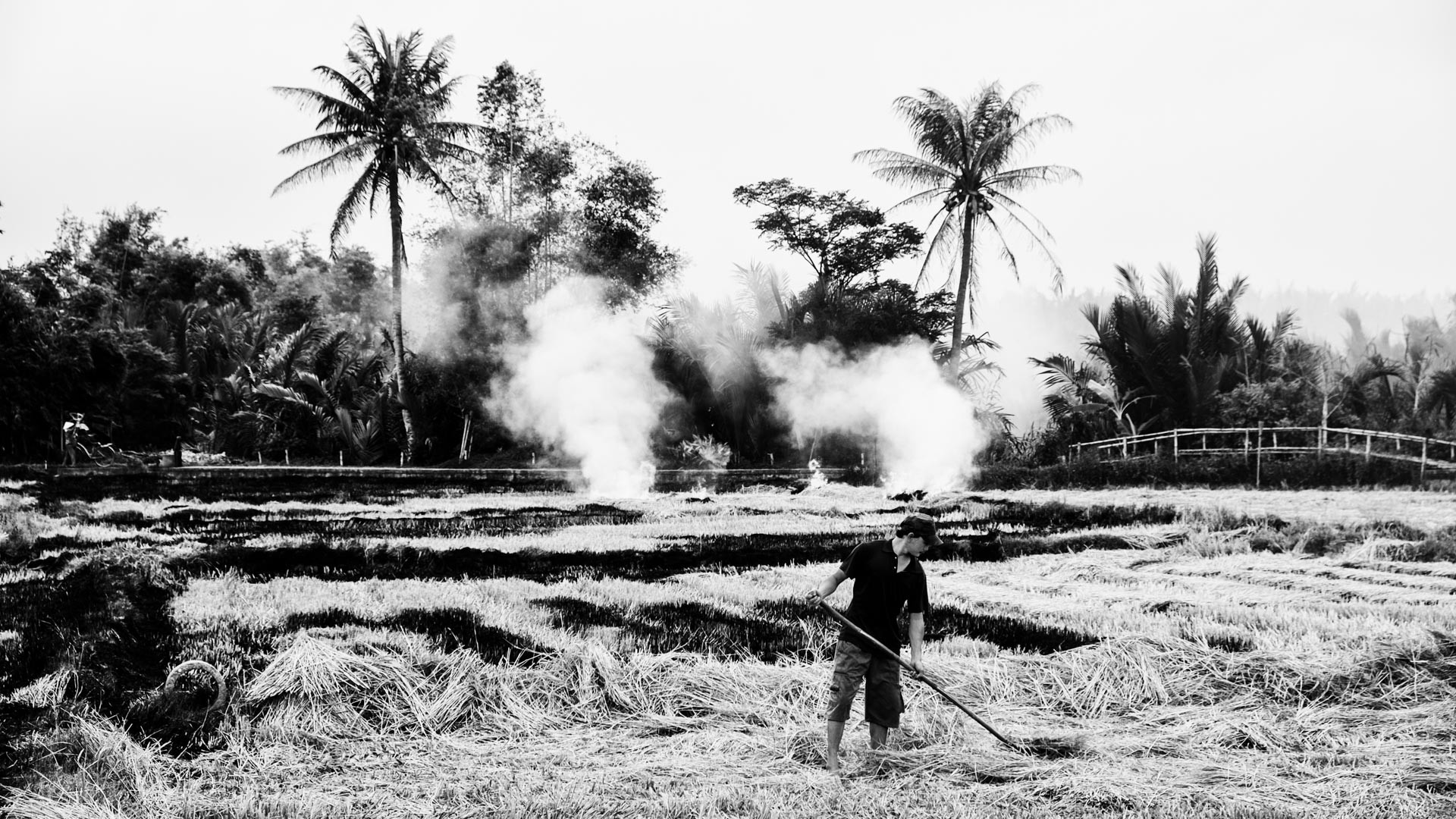 Auch dieses Foto enstand auf dem Weg zu unserem Homestay, durch die Felder, auf denen gerade die Reisernte abgeschlossen worden ist. Von dem kleinen Feldweg aus, der zu unserer Unterkunft führt, konnte ich sehen, wie nach der Ernte die Felder abgebrannt worden sind um sie für die nächste Saison vorzubereiten. Der Feldarbeiter hier im Bild steht zwar nicht mitten im Rauch, aber aufgrund des wechselnden WIndes immer mal wieder im beißendem Qualm.