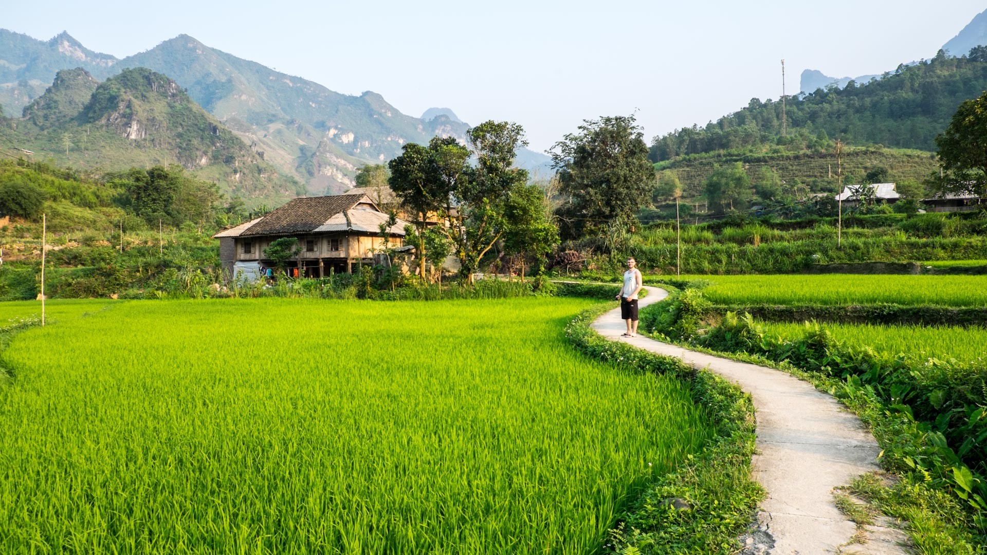 Nach diesem wahnsinnig anstrengenden (aber auch wunderschönen) 110 km Ritt auf unseren Motorrollern kamen wir endlich in Du Già an. Der Zielort der dritten Etappe war noch sehr untouristisch, klein in einem Tal mit wunderschönen Reisfeldern gelegen und wir fuhren pünktlich zu Sonnenuntergang ein, durch sattestes Grün. Auf den Essenskarten gab es erstaunlich viel Hund. Aber man merkte auch hier, dass der große Ansturm an Touristen bevorsteht. Viele homestay sind schon da oder werden gebaut, wir hatten dieses Mal ein Hostel, etwas abenteuerlich, aber nach je 5 bier war es ganz gut. Einzig die Leute zwei Zimmer (15 m in Hörweite) weiter hatten etwas an unseren Gesprächen und unser Hintergrund Musik auszusetzen. Kamen dann nach etwa 20 Minuten rüber und baten -typisch deutsch- doch bitte Rücksicht auf ihren Musikgeschmack zu nehmen, wir träfen diesen mit unser Auswahl nicht. Machen wir doch gerne! Gibt doch nichts schöneres als deutsches Gemecker mitten im Nirgendwo in den Bergen Vietnams mehrere Motorollerstunden, von der Zivilastion wie wir sie kennen, entfernt