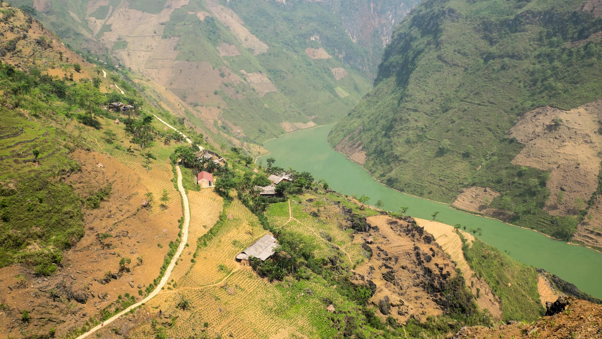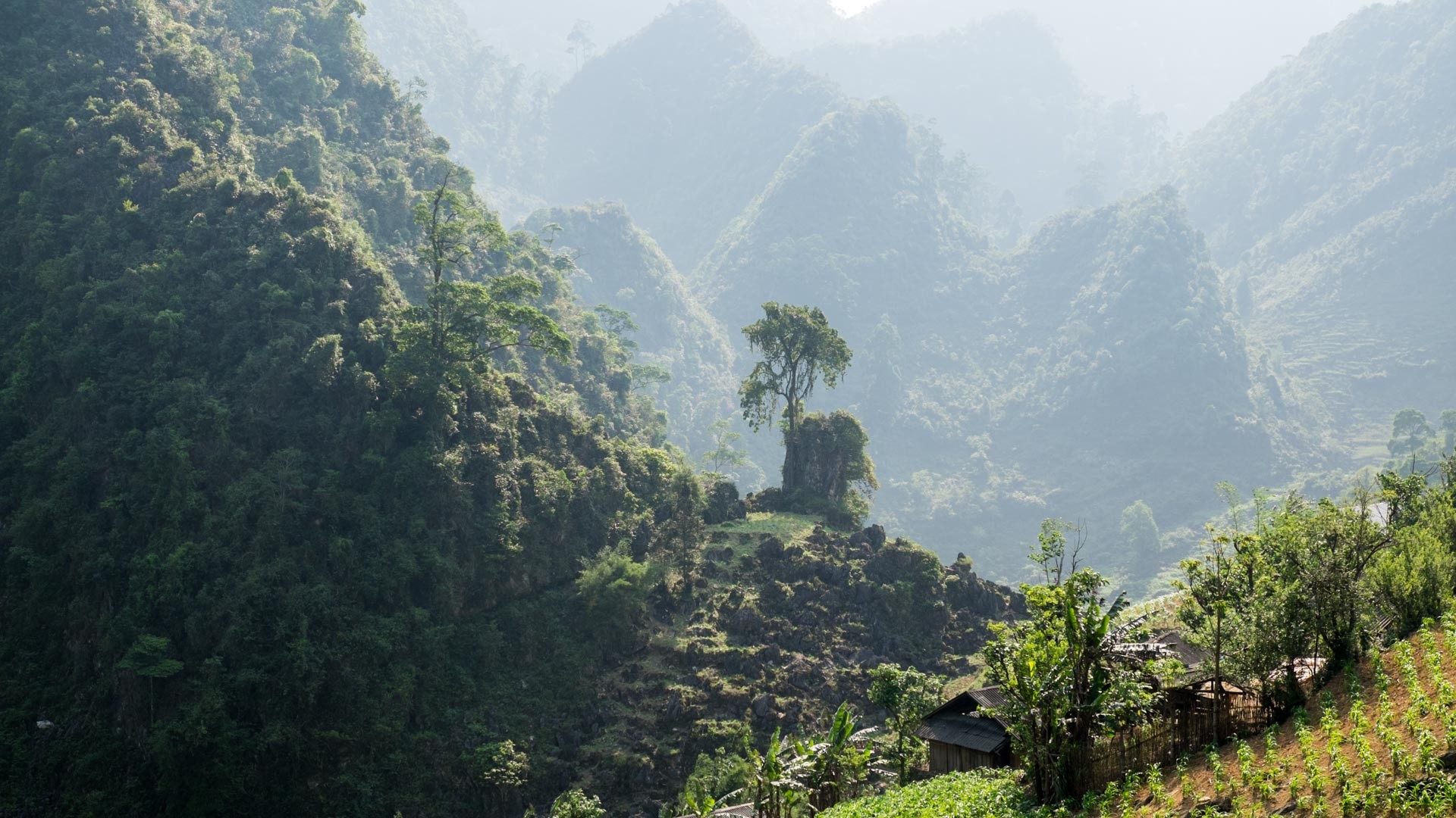 Auf dem Weg zu unserem dritten Etappenziels in Du Già fuhren wir durch zum Teil wirklich unberührte Berglandschaft. Ich berichtete ja bereits, dass wir auf dieser etwas abgelegeneren Route viele indigene Bewohner der Region gesehen haben, die ihre Felder bewirtschaftet haben. Die Spuren, nämlichen die vielen Reisterassen und Maisfeld-Monokulturen, konnten wir oft bestaunen. Trotzdem bot sich uns an vielen Stellen noch der Anblick einer schroffen, schwarz eingefärbten Karst-Gestein-Landschaft. Diese war teilweise auch noch sehr stark bewachsen mit Pflanzen, und Bäumen. Wenn man sich dann den Kontrast zu den von Menschenhand angelegten Felder, so wie es unten rechts im Bild zu sehen ist vor Augen führt, bedrückt es einen, wie stark der Mensch in die Natur eingreift. Auch wenn die in den nördlichen Bergen Vietnams lebenden EInwohner natürlich auf die Nahrung duch den Feldbau angewiesen sind.