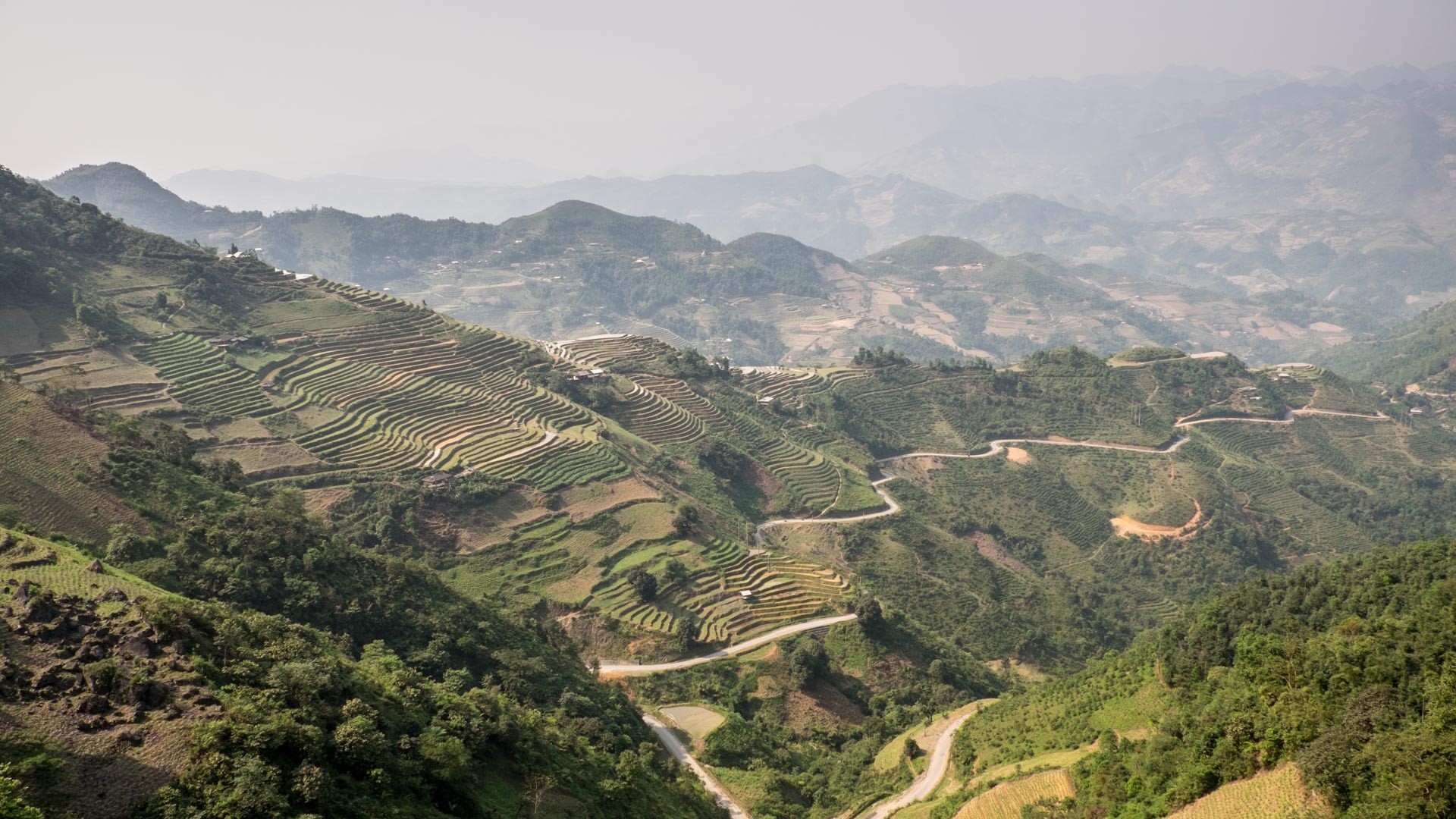 Nach unserem Abstecher hinunter ins Tal Richtung Xín Cái, sind wir den ganzen Weg wieder hoch gefahren um uns in Richtung unseres dritten Etappenziels in Du Già zu machen. Auf dem Weg dorthin verließen wir die etwas größere Straße und bogen auf eine kleinere Straße ab, die allerdings auch mehrere schöne Pässe durch die Berge zu bieten hatte. Auf dieser etwas abgelegeneren Route haben wir viele indigene Bewohner der Region gesehen. Dort hoch im Norden Vietnams lebt eine große Zahl an kleinen indigenen Bevölerungsgruppen, die zum Teil noch wie vor hundert Jahren leben. Größtenteils leben sie vom Ackerbau, ausgeführt in traditioneller, sehr bunter Kleidung. Leider habe ich keine Bilder, da sich niemand fotografieren lassen wollte. Was ich natuerlich respektiere, aber trotzdem gerne gezeigt hätte. Oftmals wird Reis angebaut, die Terassen werden dann von Menschenhand in die steilen Hänge ohne technisches Gerät angelegt. Überall entlang der Straßen stehen dann Motorroller, und wenn man genau hinsieht sieht man irgendwo in den Hängen die zugehörigen Arbeiterinnen und Arbeiter bei bestellen der Felder, Reisterassen und Hänge.