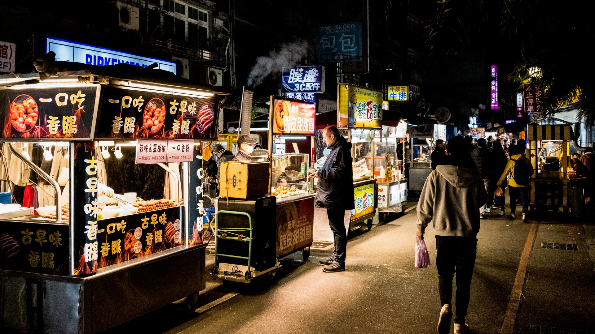 Auf dem Nachtmarkt war es zwar voll, aber doch recht angenehm. Eine Mischung aus Touristen, Expats und Einheimischen, viele verschiedene Stände mit Essen oder Krimskrams und dazwischen immer mal wieder ein paar Plastikstühle und Bänke auf denen man sitzen und essen kann. Der Night Market ist entlang einer Strasse, die von Häusern gesäumt ist, dadurch ziemlich eng. In den Häusern sind zumeist Restaurants, Spielmöglichkeiten für Kinder und Erwachsene – Kirmes-Sytle – oder Eis und Bubble Tea zu finden.