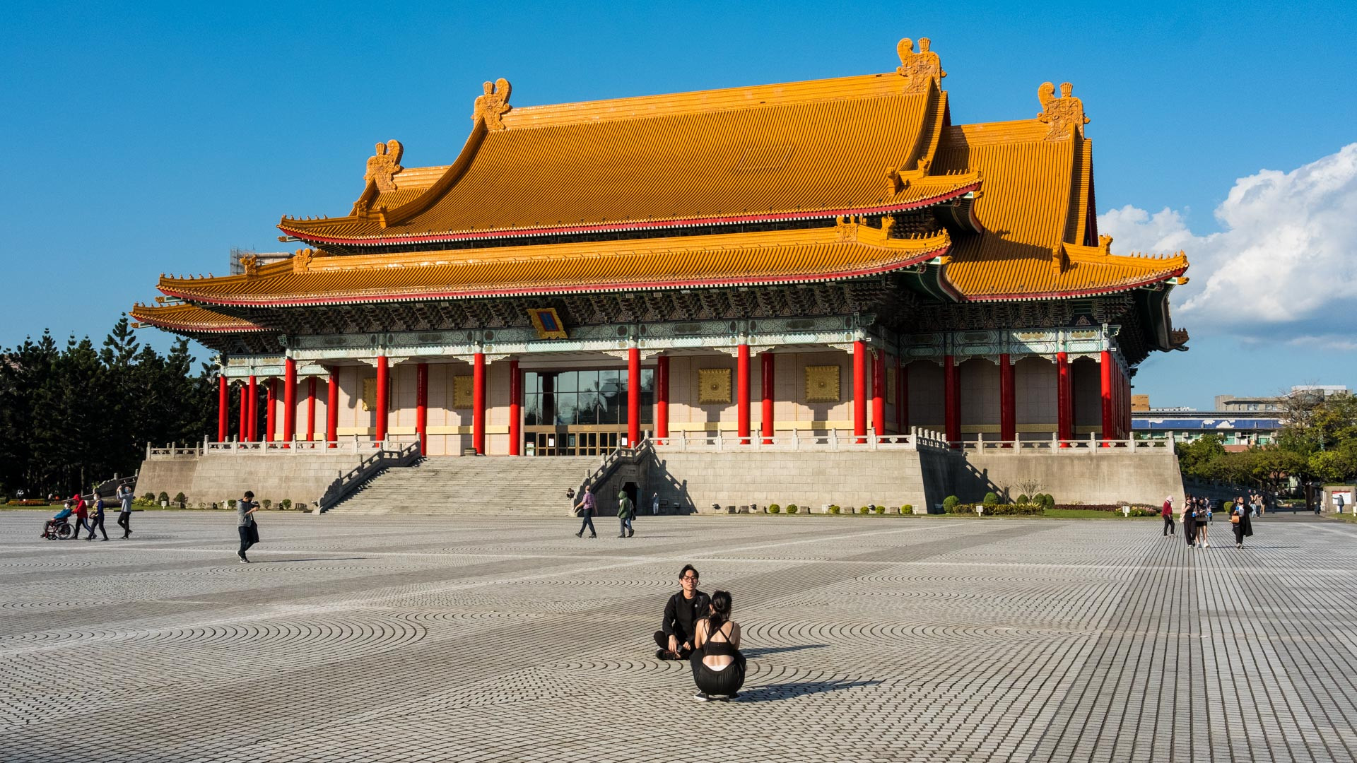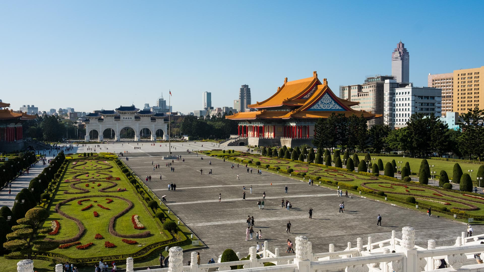 Mit Japans Niederlage im Zweiten Weltkrieg stellten die Alliierten Mächte Taiwan wiederum unter Verwaltung Chinas, welches Taiwan als chinesische Provinz eingliederte. Im Nachgang des Chinesischen Bürgerkriegs zog sich die geschlagene Kuomintang-Regierung 1949 nach Taiwan zurück, um von dort aus als offizielle, nichtkommunistische Vertretung Chinas unter dem Namen „Republik China“ zu agieren. Taiwan gehört zu den Gründungsmitgliedern der UNO und hatte zunächst den Anspruch, ganz China zu vertreten. 1971 verlor sie diese Stellung an die Volksrepublik China. Seit 2016 stellt die die Demokratische Fortschrittspartei (DPP) die Mehrheit im Parlament und die Präsidentin. (Quelle FU Berlin). Zu sehen ist eines von zwei Baugleichen Gebäuden, die Nationale Konzerthalle. Gegenüber ist das Nationale Theater zu finden.