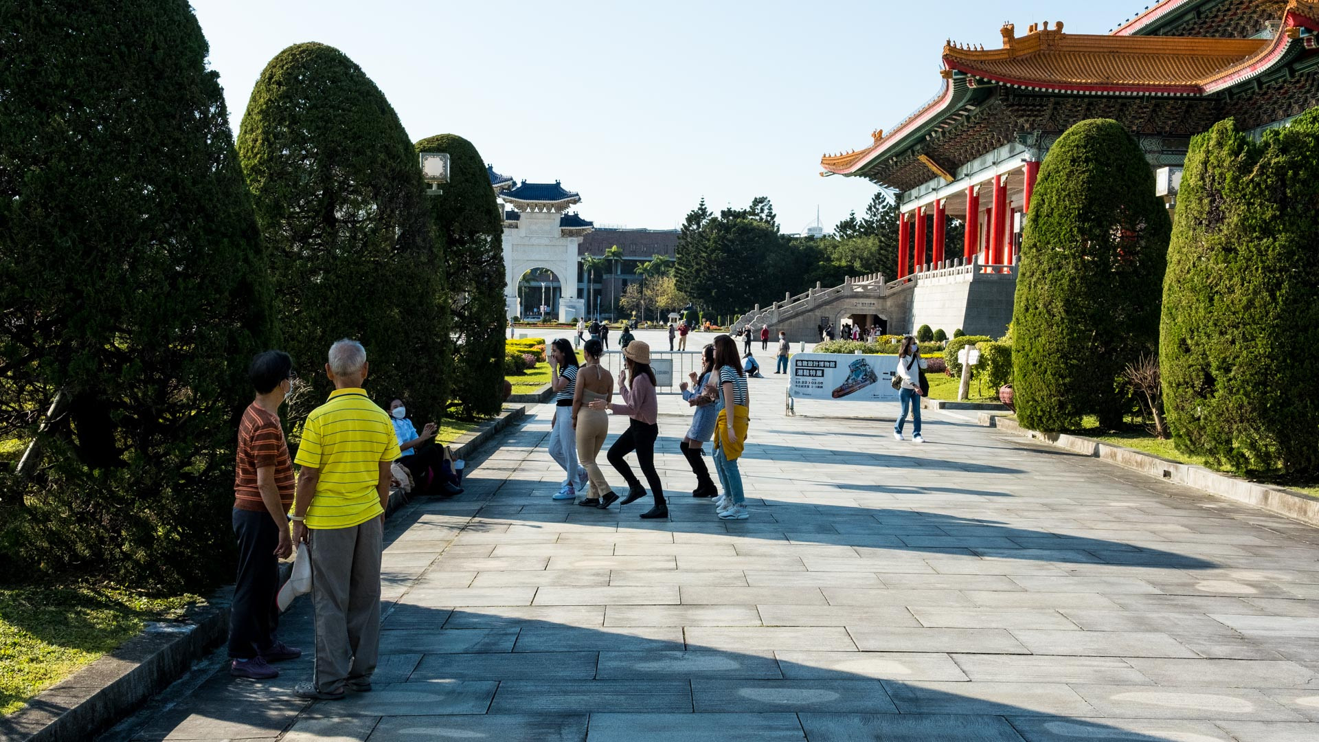 Mit Japans Niederlage im Zweiten Weltkrieg stellten die Alliierten Mächte Taiwan wiederum unter Verwaltung Chinas, welches Taiwan als chinesische Provinz eingliederte. Im Nachgang des Chinesischen Bürgerkriegs zog sich die geschlagene Kuomintang-Regierung 1949 nach Taiwan zurück, um von dort aus als offizielle, nichtkommunistische Vertretung Chinas unter dem Namen „Republik China“ zu agieren. Taiwan gehört zu den Gründungsmitgliedern der UNO und hatte zunächst den Anspruch, ganz China zu vertreten. 1971 verlor sie diese Stellung an die Volksrepublik China. Seit 2016 stellt die die Demokratische Fortschrittspartei (DPP) die Mehrheit im Parlament und die Präsidentin. (Quelle FU Berlin). Zu sehen ist der Platz der Freiheit direkt an der Chiang-Kai-shek-Gedächtnishalle.