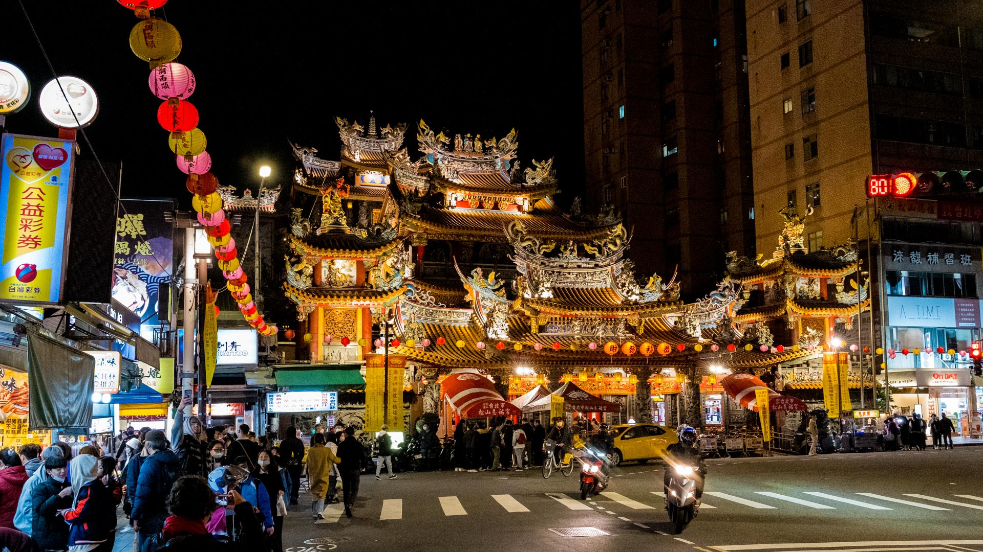 Der Eingang zum Raohe Night Market im Songsahn District liegt links neben dem Songshan Ciyou Temple, von weitem etwas versteckt. Der Tempel selbst ist allerdings von weitem gut zu erkennen, er ist Göttin Matsu gewidmet und um die Mitte des 18. Jahrhunderts erbaut worden. Leider hatten wir keine Zeit, den Tempel von innen an zu schauen, weil wir so hungrig waren und auf den Night Market wollten.